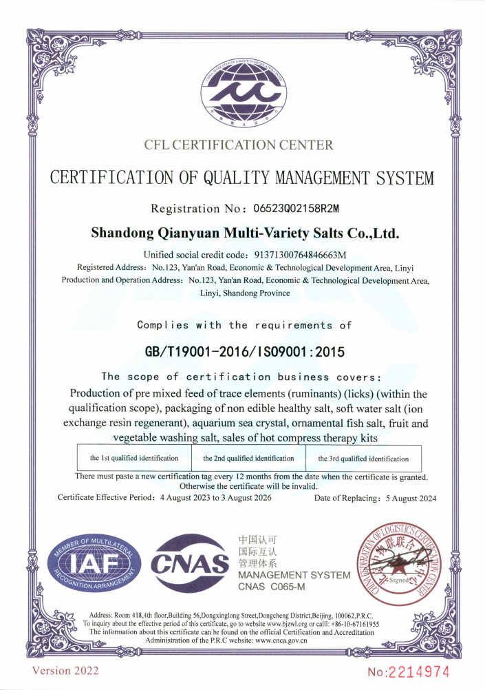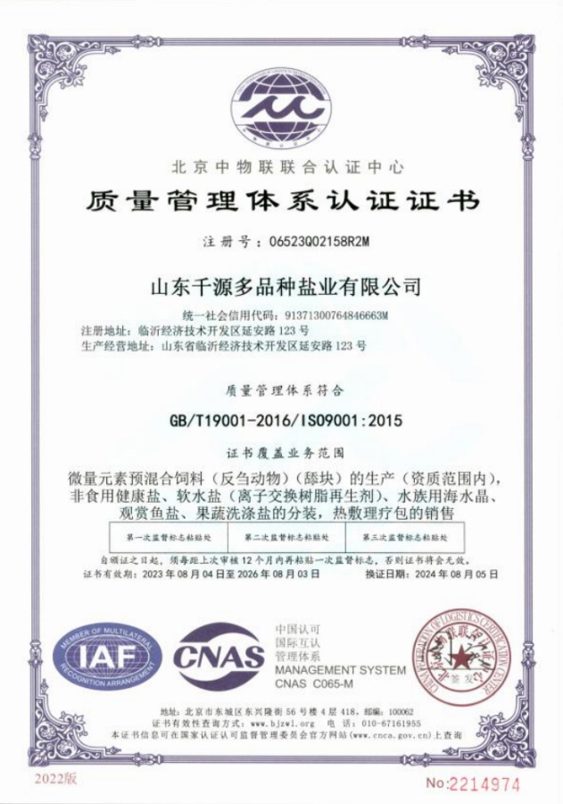 山東千源多品種鹽業(yè)有限公司坐落于山東臨沂經(jīng)濟(jì)技術(shù)開(kāi)發(fā)區(qū),隸屬于臨沂市國(guó)有資產(chǎn)投資控股集團(tuán),占地面積9萬(wàn)平方米,專(zhuān)業(yè)研制、開(kāi)發(fā)、進(jìn)出口、生產(chǎn)軟水鹽(離子交換樹(shù)脂再生劑)、畜牧營(yíng)養(yǎng)舔塊、觀(guān)賞魚(yú)專(zhuān)用鹽、熱敷鹽、沐浴鹽、果蔬洗滌鹽等系列鹽產(chǎn)品。